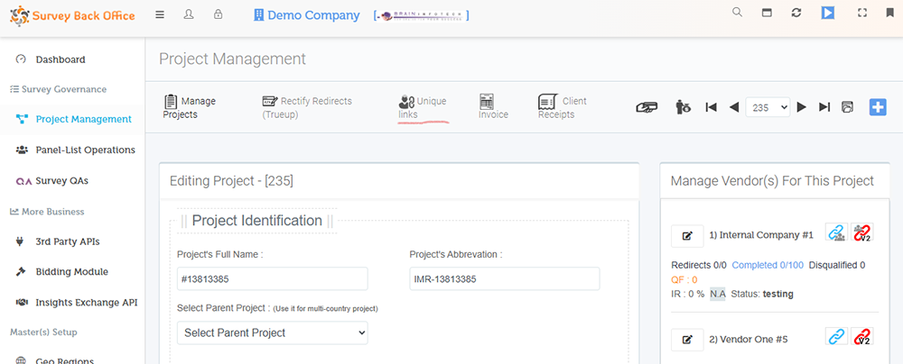 Unique links are survey links only, but each survey/study would have a different link. Which means the primary domain would be the same, but the link parameters will vary and will be unique for each survey, but for a particular project only. It might be same or different for each project, which totally depends on your client who provides you these links.